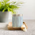 The Fog Wax Melt Jar is hand painted in vertical bands of blue gray and a very muted soft shade of mint.